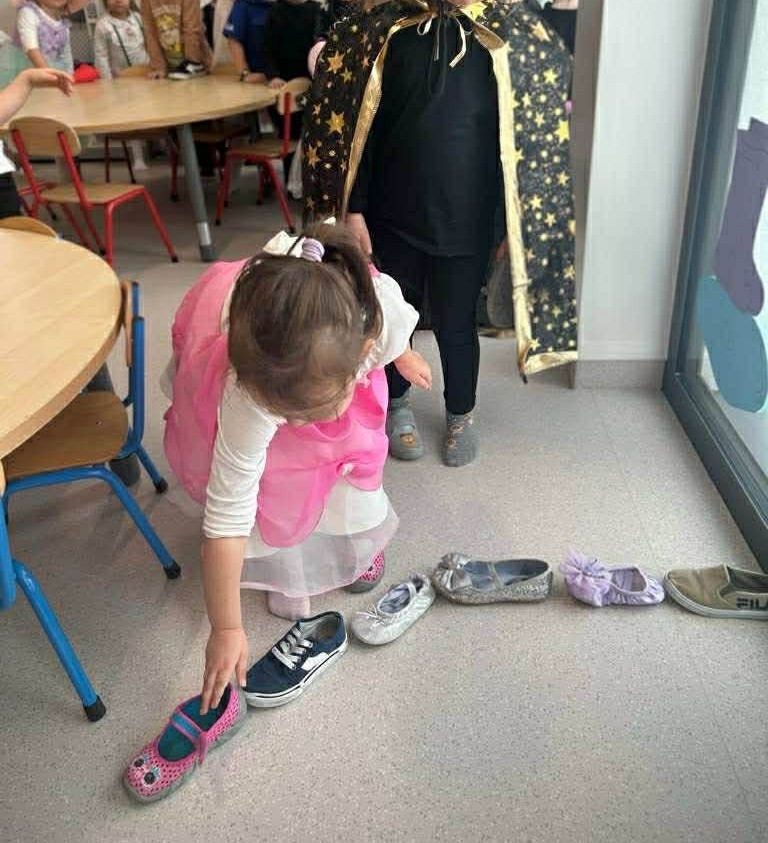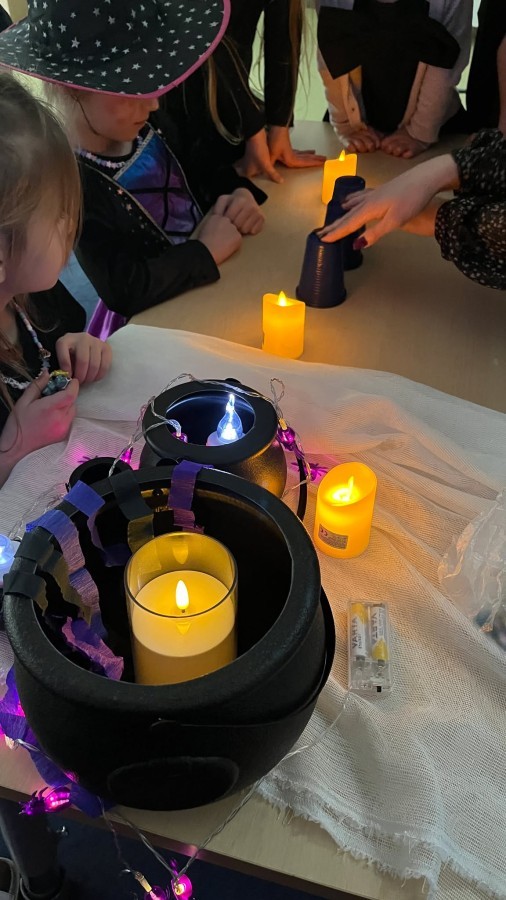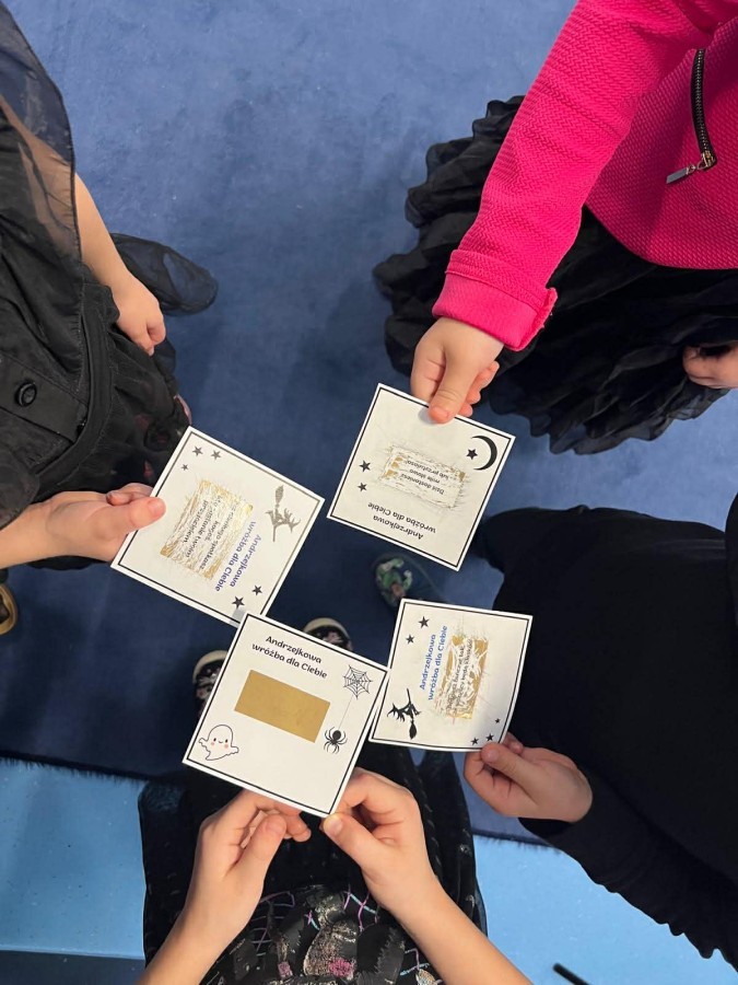 W każdej sali czekały na nich różne magiczne atrakcje: wróżby z imieniem i szpilką, ustawianie butów prowadzące do odkrycia przyszłości 🥿👠, lanie wosku, kolorowe mikstury oraz wiele innych ciekawych wróżb, które pobudzały wyobraźnię i zachęcały do wspólnej zabawy 🔮