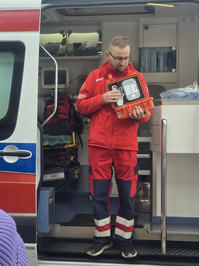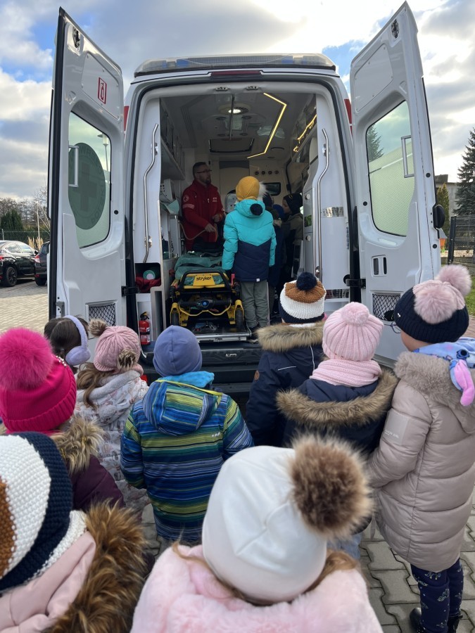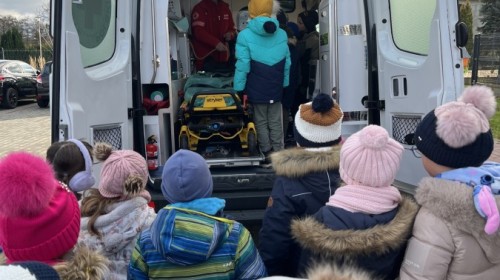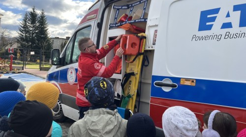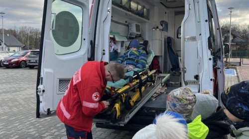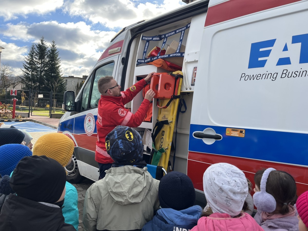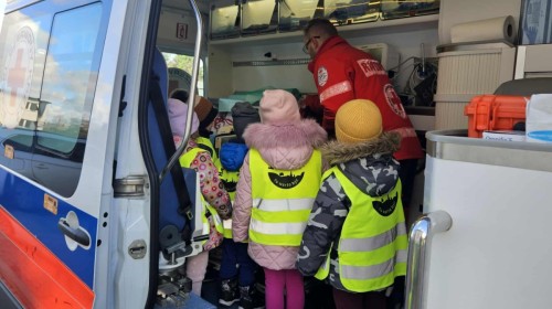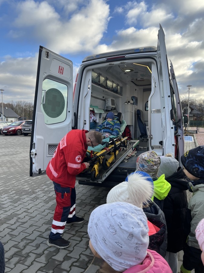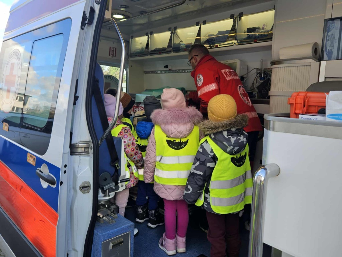 Ogromną atrakcją była możliwość zajrzenia do wnętrza karetki oraz obejrzenia jej wyposażenia. Dzieci zobaczyły także, co znajduje się w specjalistycznej torbie ratowniczej – od opatrunków i masek, po sprzęt diagnostyczny.