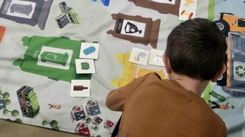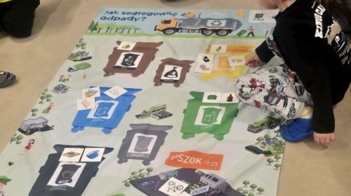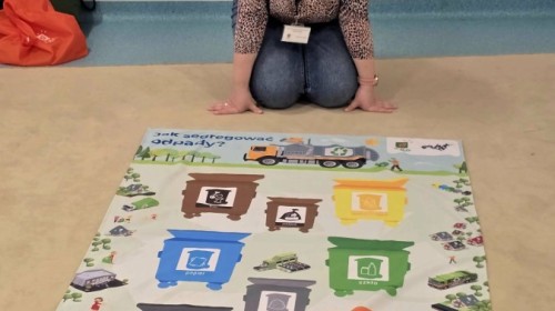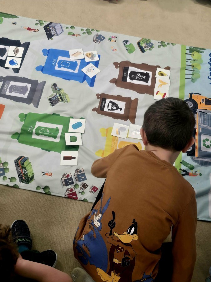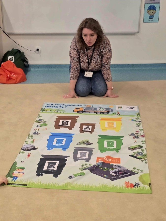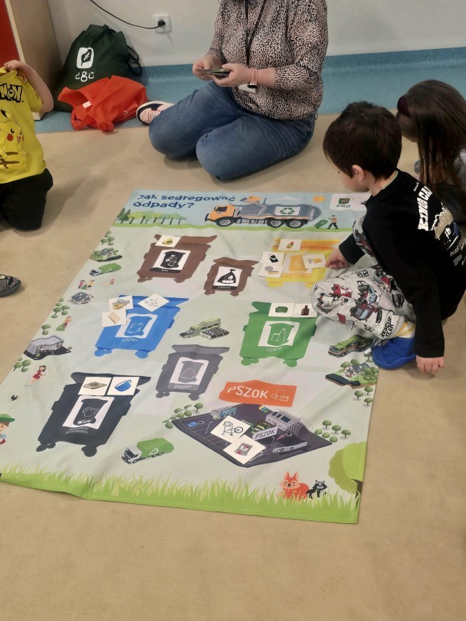 Podczas warsztatów dzieci dowiedziały się, jak prawidłowo segregować śmieci, rozpoznawały kolory poszczególnych koszy i rozmawiały o ich przeznaczeniu. Dzięki praktycznym przykładom i wspólnej zabawie utrwaliły zasady dbania o środowisko 🌍