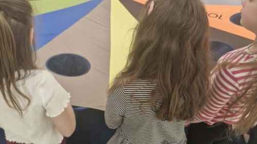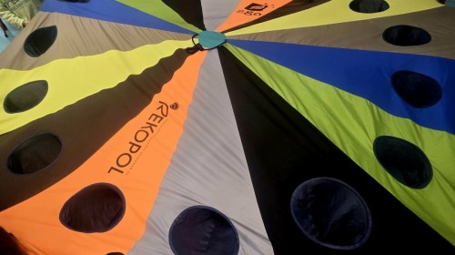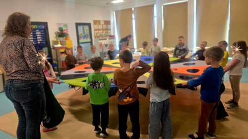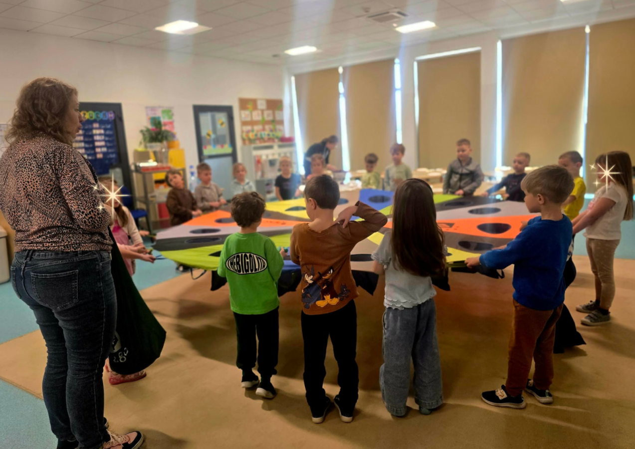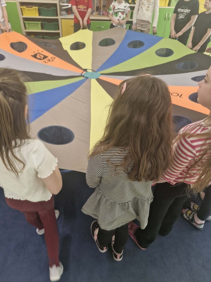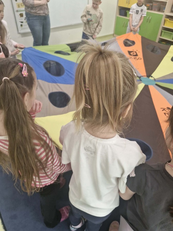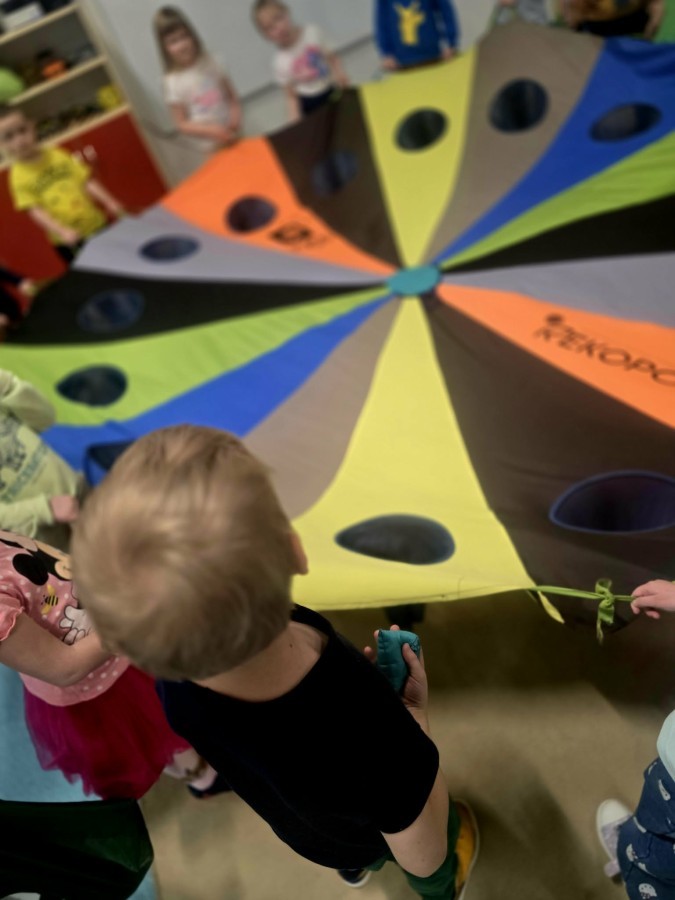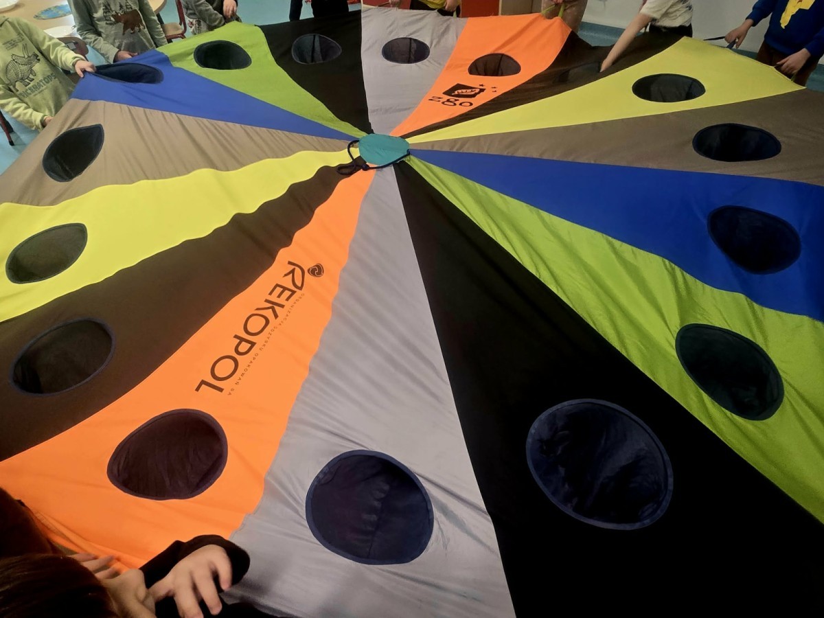 Na zakończenie spotkania przedszkolaki bawiły się chustą animacyjną, integrując się i świetnie spędzając czas. Dziękujemy za wartościowe zajęcia i cenną lekcję ekologii! 🌿